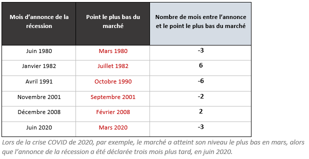 Comme exposé dans le tableau ci-dessous, depuis 1980, pour deux épisodes de récession sur trois, le marché boursier avait déjà atteint son niveau le plus bas avant l’annonce.